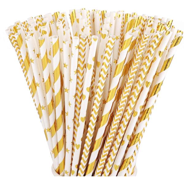 7.75 Inches Biodegradable Gold Striped Star Wave Heart Paper Straws Images |